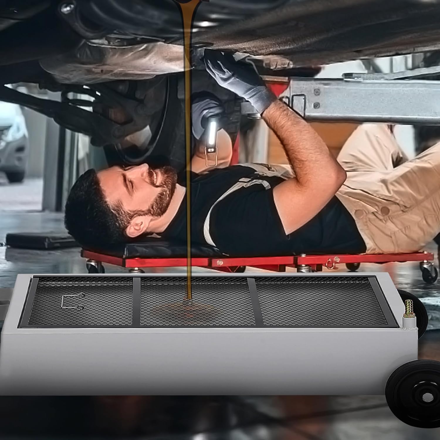 15 Gallon Low Profile Oil Drain Pan, Oil Drain Cart with Manual Pump, 8 Ft Hose & T Folding Handle