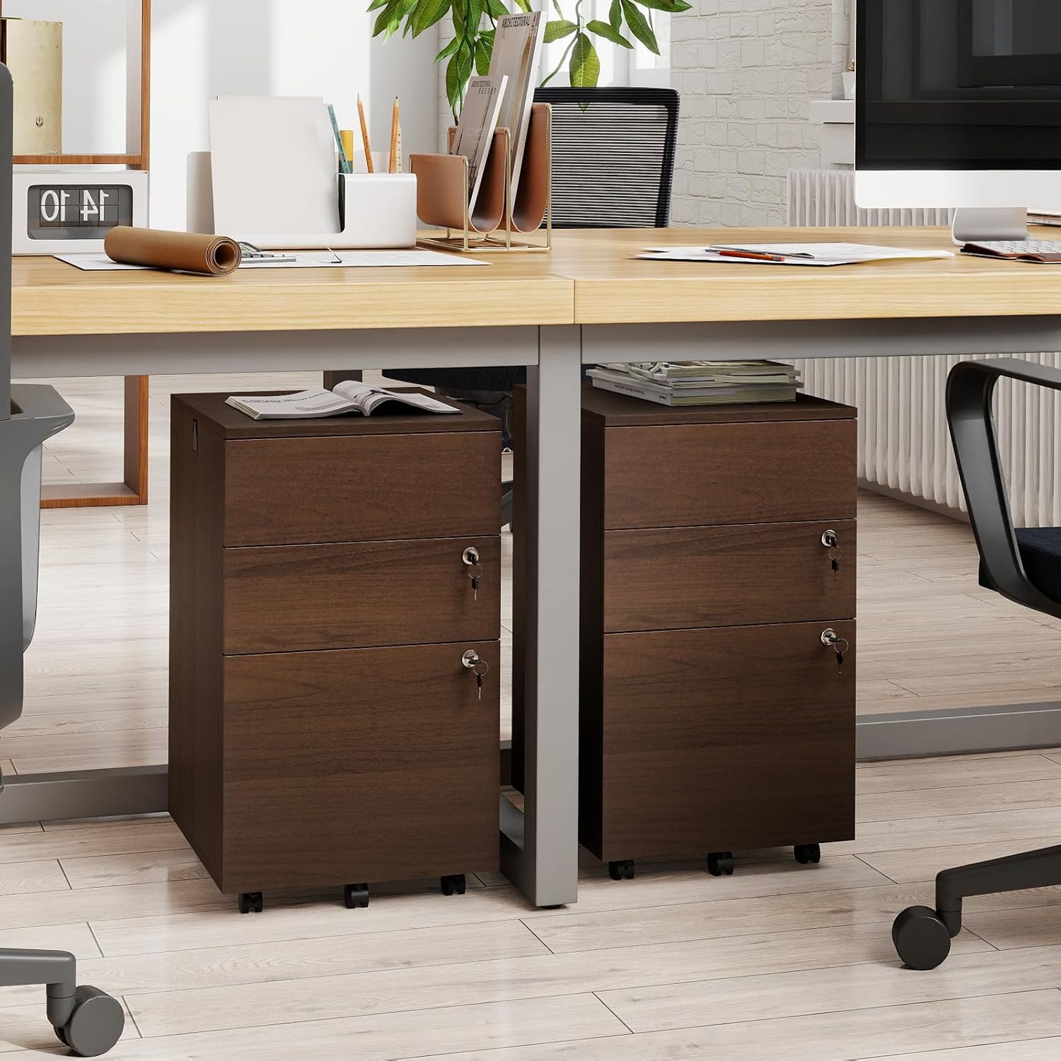 DescriptionDiscover streamlined storage with our vertical filing cabinet. Designed to fit neatly under a desk, this cabinet features two small drawers and one larger file drawer, topped by a spacious surface for additional organization. Mobility is made simple with five rolling wheels, including two that lock to ensure stability. The added convenience of two side hooks provides a handy spot to hang earphones or charging cables. Ideal for both office and home use, this cabinet facilitates organization without compromising on space.Features·5 casters for easy mobility·2 lockable wheels for stability·3 drawers and large top for diverse storage needs·Thickened boards for durability·2 side hooks for easy access·Smooth drawer slides for convenience·2 drawers with locks for privacy·Smooth and waterproof surface easy to cleanSpecificationMaterial: Engineered Wood, MDFOverall Dimension: 15.5’’ x 18’’ x 27’’/39cm x 45cm x 68cm(W x D x H)Inner Size of Small Drawer: 12’’ x 15.5’’ x 2.5’’/31cm x 40cm x 6cm(W x D x H)Inner Size of File Drawer: 12’’ x 15.5’’ x 9.5’’/31cm x 39.5cm x 24cm(W x D x H)Net Weight: 42.5 lbs/19.26kgPackage Includes:1 x File Cabinet1 x Instruction