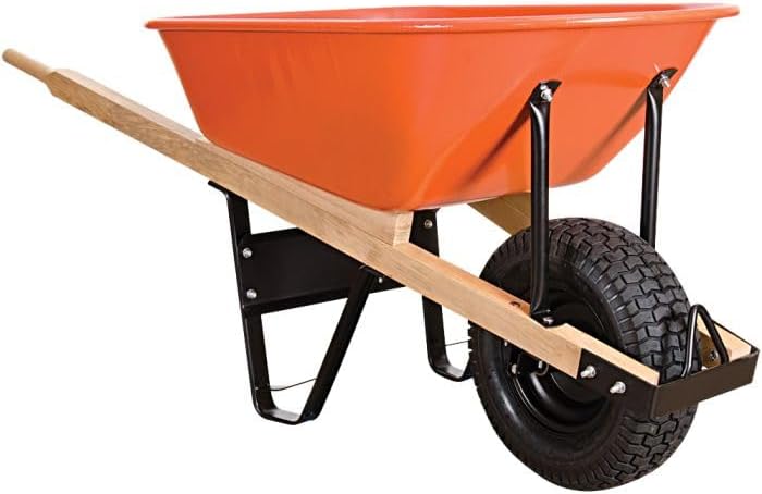 Leonard 6-Cubic-Foot Steel Tray Wheelbarrows combine strength and maneuverability with a durable design. Featuring a powder-coated orange steel tray and an upgraded welded steel tray support, these wheelbarrows can carry up to 500 pounds. They include a precision ball bearing system, a heavy-duty 5/8-inch steel axle, and a 16-inch tire. With a narrow profile for easy passage through doors and gates, these wheelbarrows are designed to outlast typical consumer-grade options, offering superior durability and a lifetime warranty. Choose from either extra-thick wood or steel handles. Available with either a pneuatic or flat-free tire.